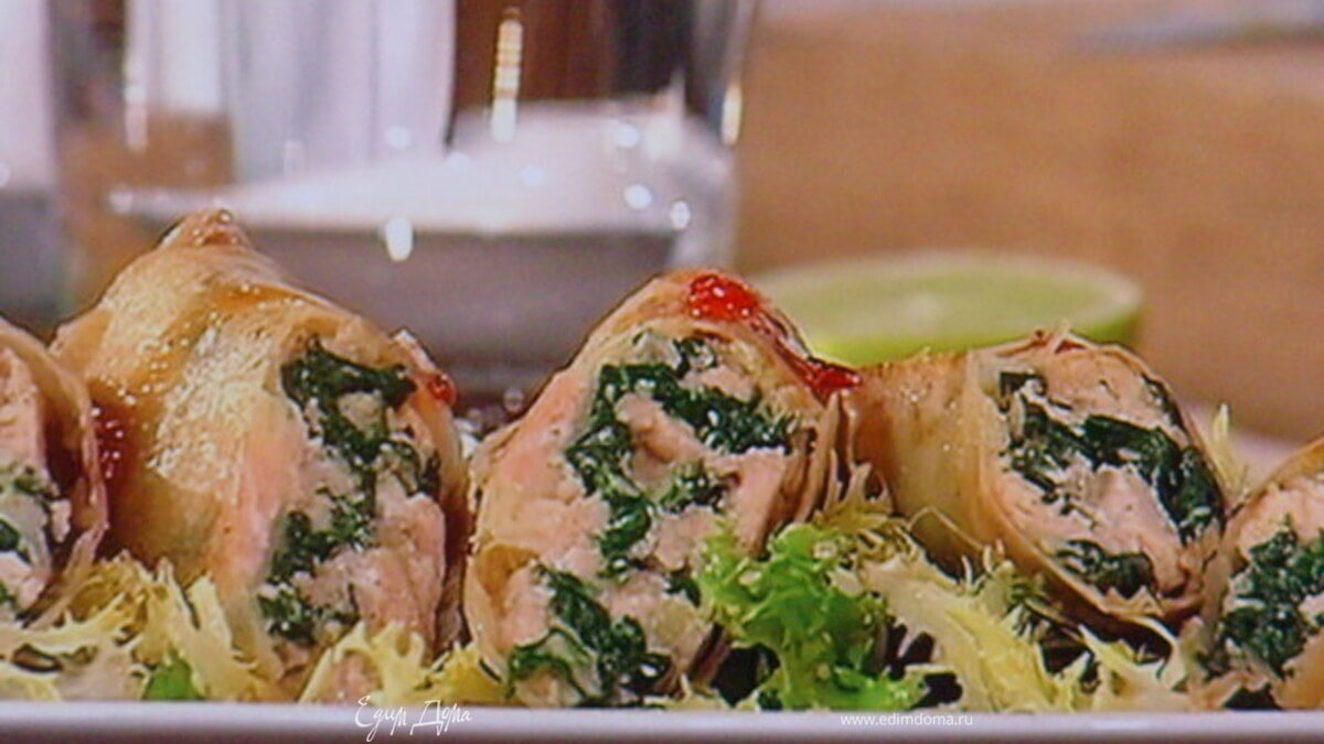 Шпинат промыть, обсушить кухонным полотенцем и припустить в разогретом масле( 20 мл ) с мелко порубленым шалотом, имбирём и чесноком, посолить, поперчить, влить половину соевого соуса. Охладить. - Шаг 1