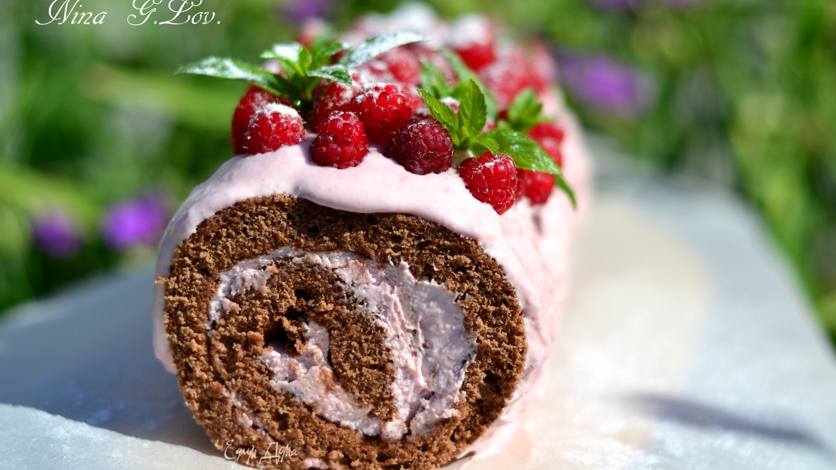 Украсить рулет оставшимся кремом и остальной малиной, листиками мяты и сахарной пудрой. Приятного аппетита!