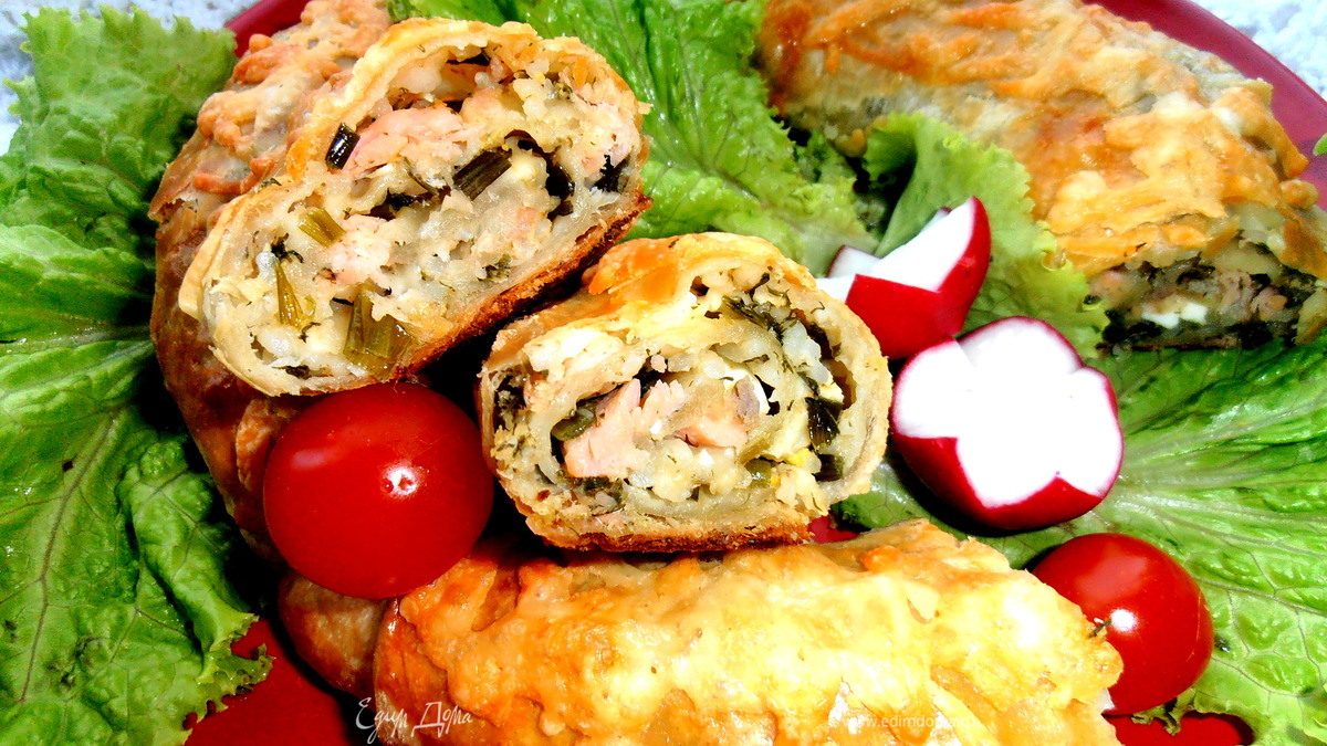 Захотелось рыбки? Можно всю семью накормить вкуснейшим штруделем всего из небольшого кусочка лосося с рисом и луком..., благо зелени сейчас "хоть отбавляй"))) Особенно притягательна в штруделе сырная корочка! Да и вся начинка в гармонии со слоёным тестом)))