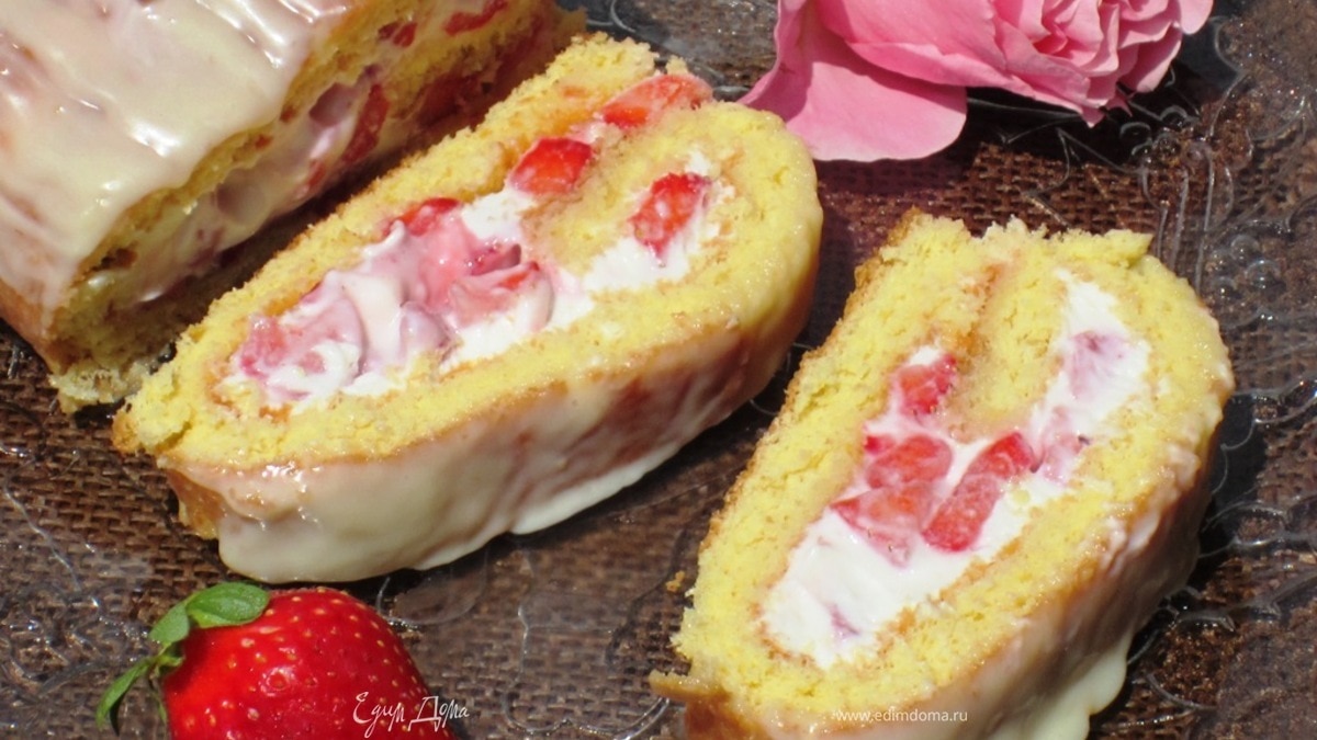 Клубничный рулет с нежным сливочно-творожным кремом