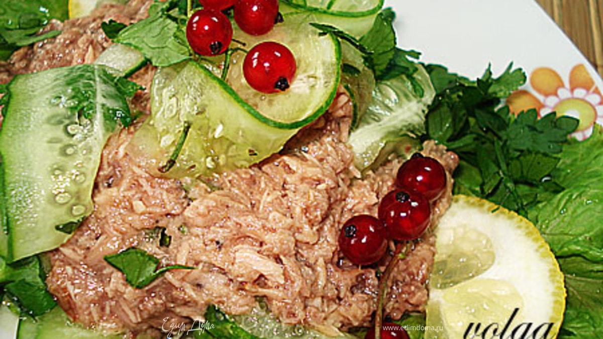 На тарелку положить листья салата, сверху полоски огурца, петрушку и тунец. Можно добавить перец. Полить лимонным соком. Украсить ягодами красной смородины.