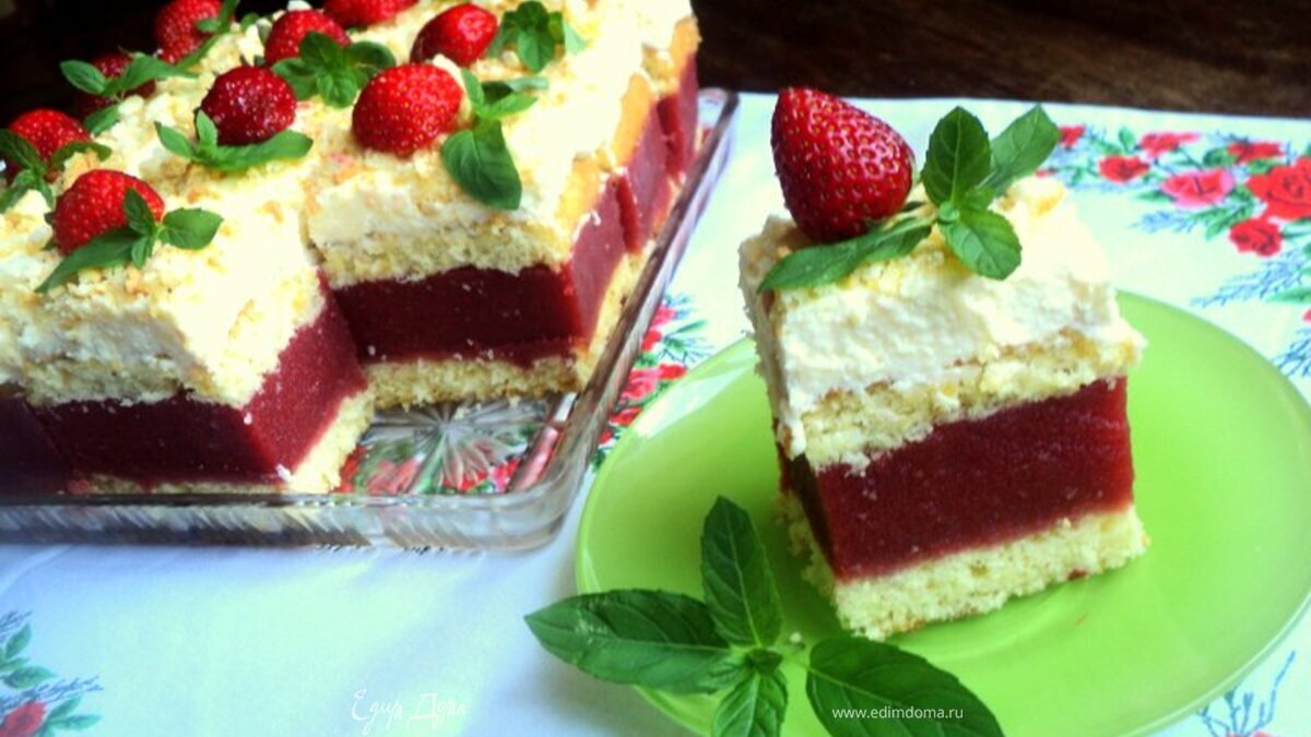 Очень яркий летний пляцок! Сочетание нежного бисквита, сливочного крема и клубничного суфле никого не оставит равнодушным!