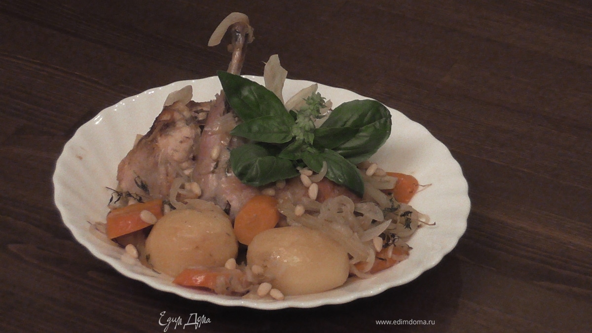 Кролик, тушенный в вине с овощами и кедровыми орехами