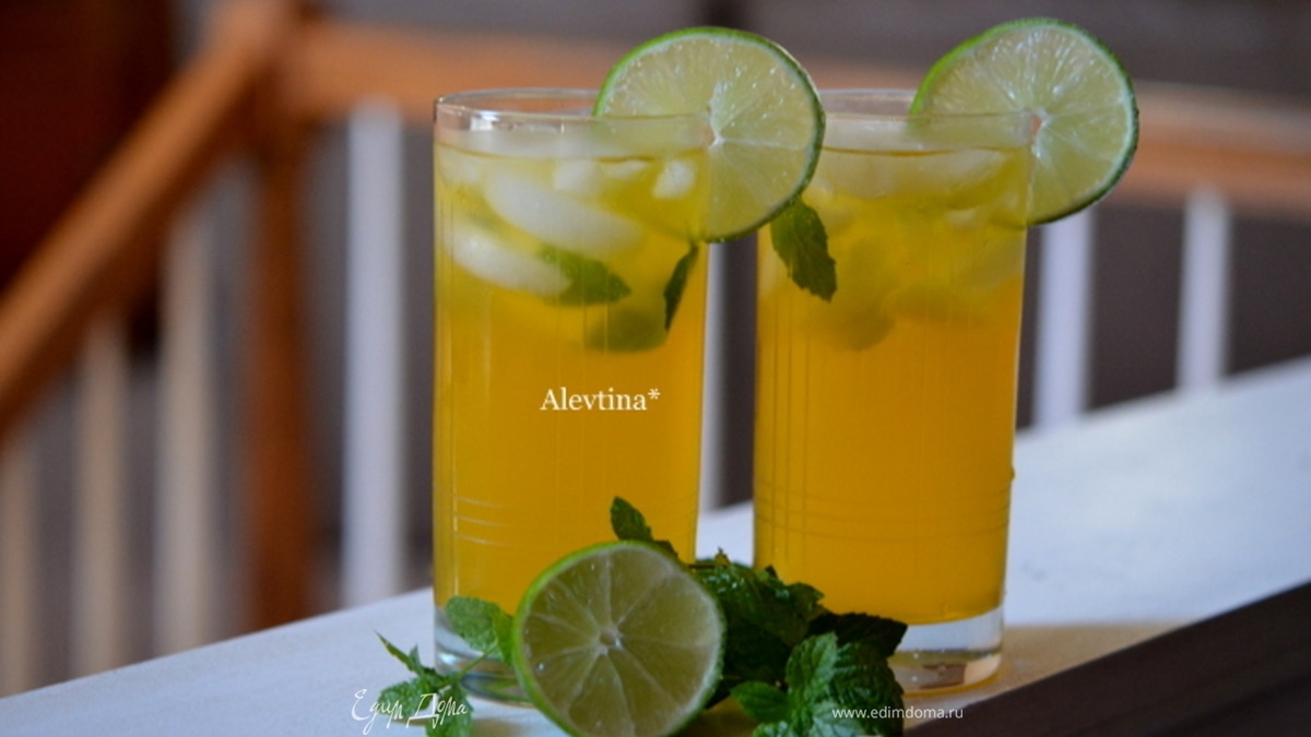 Разложить лед пищевой по высоким стаканам с мятой. Лайм порезать кружками, сок от 3х лаймов выжать добавить в стаканы с ромом. Добавить готовый чай. - Шаг 2