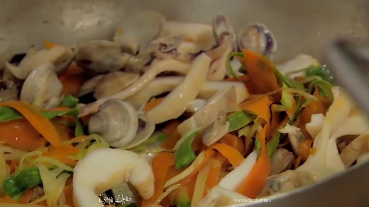 - Шаг 8Удалить с осьминога черную пленку, нарезать его небольшими кусочками, посолить и поперчить.