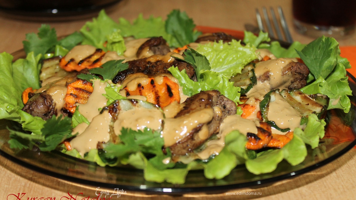 На тарелку выложить салатные листья, сверху морковь,огурцы, печень, листочки кинзы или любой другой зелени и тонкой струйкой облить всю эту красоту соусом. Приятного аппетита.