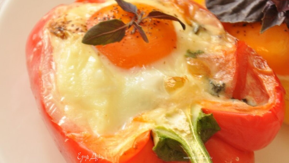 Перец порезать пополам, вынуть семечки. Мелко порезать бекон и уложить на дно половинок перчиков. Сверху выложить кусочки томатов, присыпать мелко порубленным базиликом. Сверху положить чайную ложку сливочного сыра (плавленного или др.). Вбить яйцо, посолить, поперчить и запечь в духовке. Если перец очень крупный или толстокожий, можно сначала запечь немного перец с начинкой без яйца, а потом вбить яйцо и запечь снова.