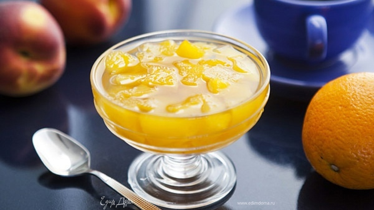 Персики ошпарить крутым кипятком, снять кожицу. Разрезать плоды пополам и удалить косточки. Апельсины очистить от кожуры и косточек. Нарезать фрукты маленькими кусочками.