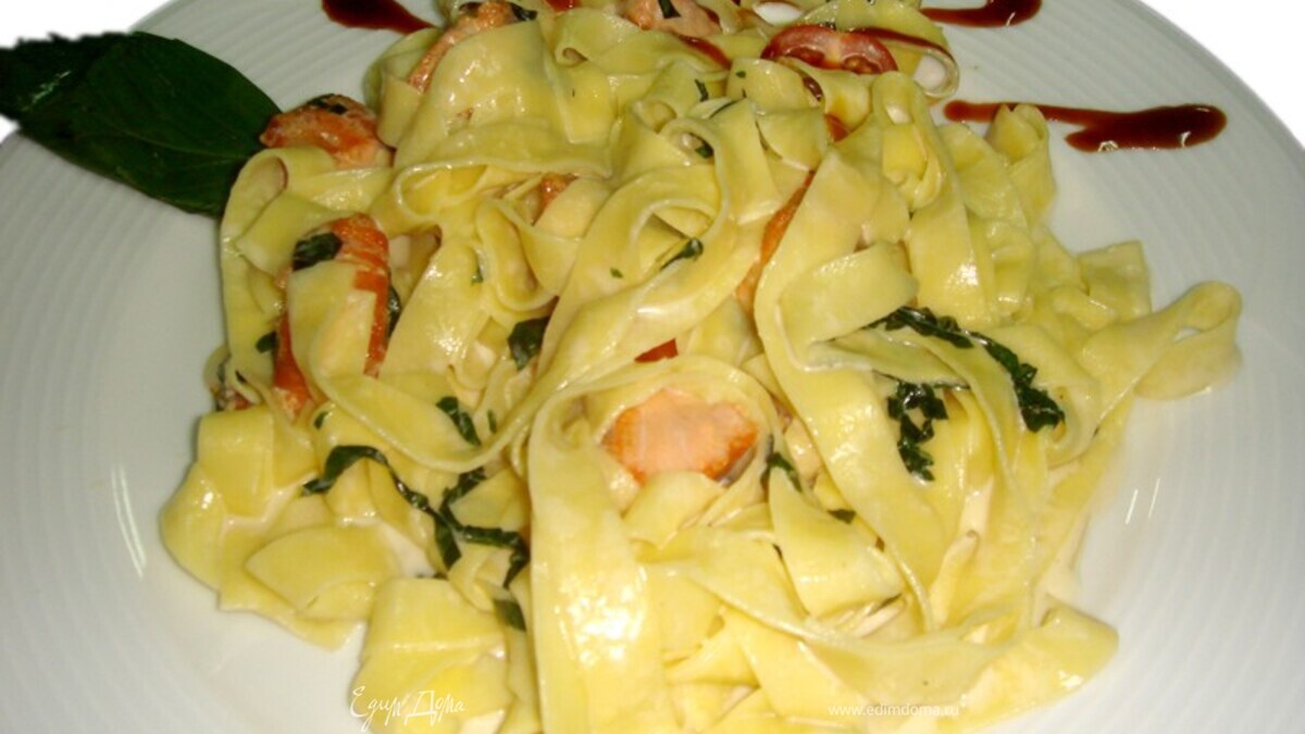 - Шаг 1Стейк семги разрезать на кусочки. Сыр нарезать кусочками, положить в кастрюлю, залить нежирными сливками и нагреть так, чтобы сыр расплавился, но сливки не кипели. Положить кусочки рыбы, довести до кипения. Если посуда с толстым дном и может держать тепло, то можно после закипания снять и оставить под закрытой крышкой минут 7. Если такой посуды нет, то можно оставить на это же время на очень маленьком огне. Сварить таглиателли. Выложить их на порционную тарелку, сверху разложить соус из сливок и лосося, посыпать пармезаном, украсить листочками базилика.