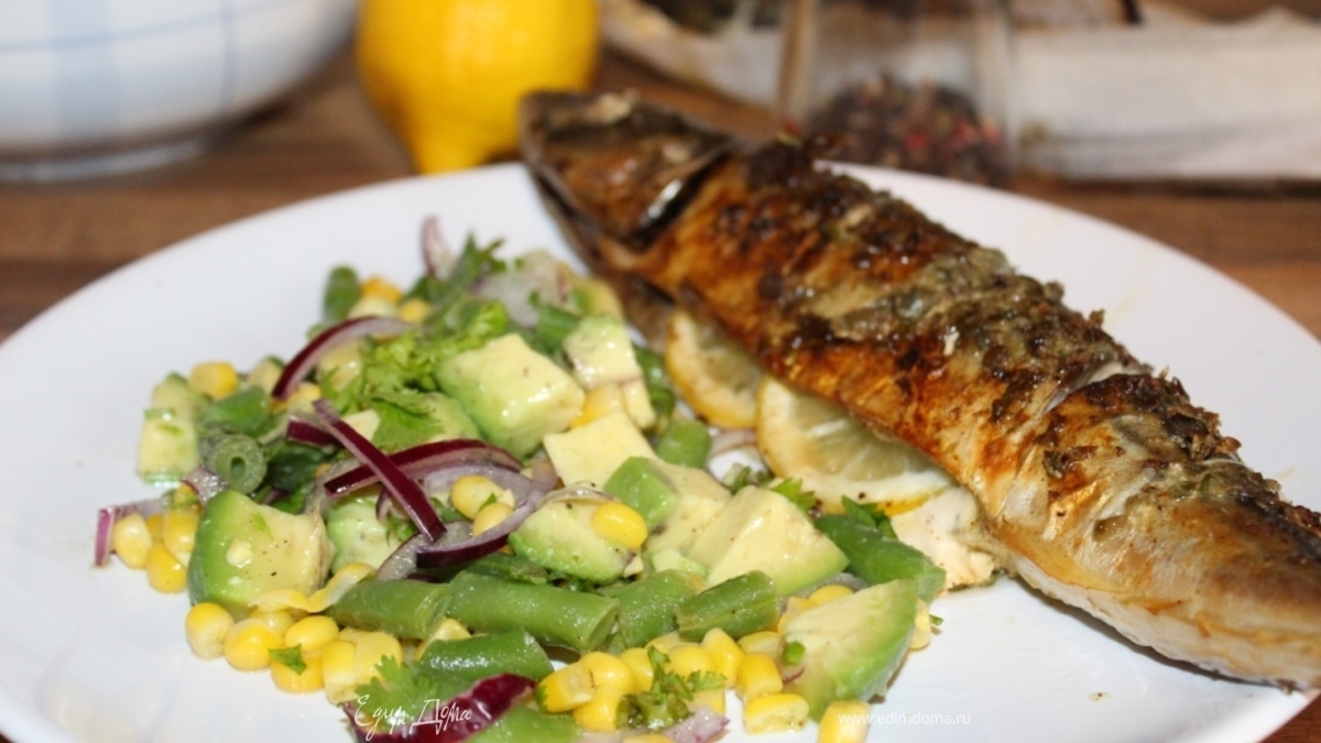 11Ингредиенты 2 средние скумбрии 25-30 г сливочного масла 1 ст.л. каперсов сок и цедра 0,5 лимона 2 дольки лимона 2 ст.л. измельчённой кинзы (или смесь петрушки и базилика) соль, перец Салат: 200 г консервированной или мороженной кукурузы 200 г зеленой стручковой фасоли 1 спелый плод авокадо 1 маленькая красная луковица сок 0,5 лимона 2-3 ст.л. измельчённой кинзы оливковое или любое растительное масло соль, перец