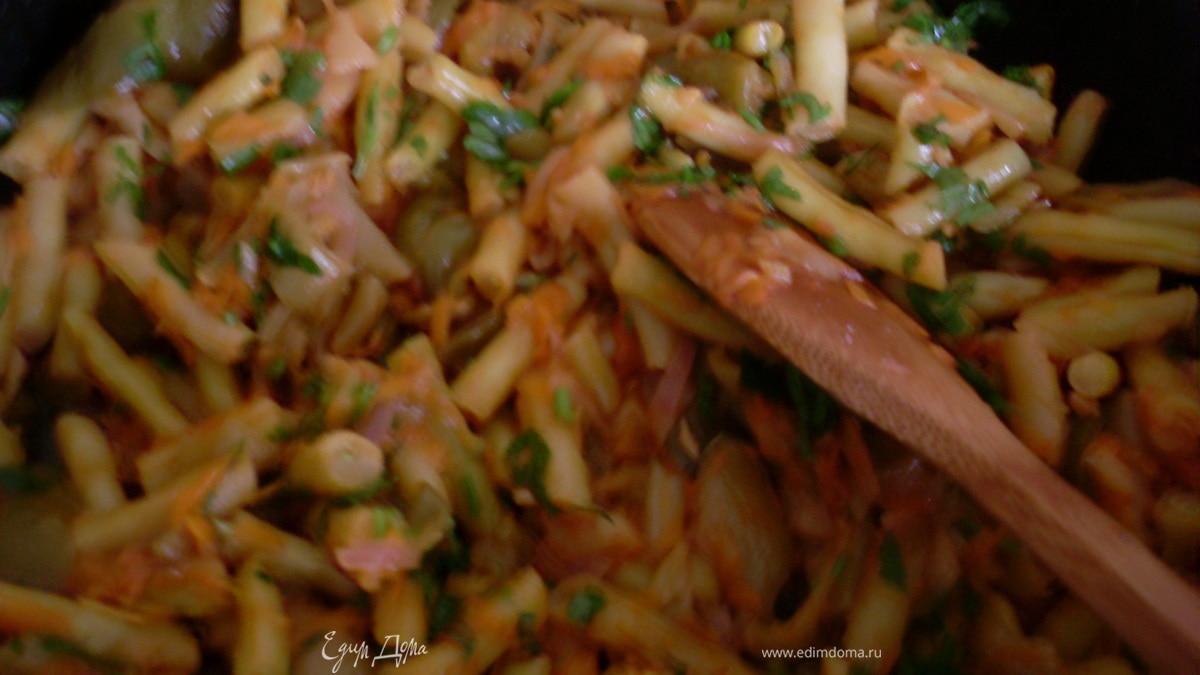Сложить нарезанные произвольными кусочками запеченный перец и фасоль, добавить немного воды, тушить пока фасоль полностью не приготовится, внимательно следить, чтобы не переварить фасоль (в моем случае ушло 10 минут). - Шаг 6
