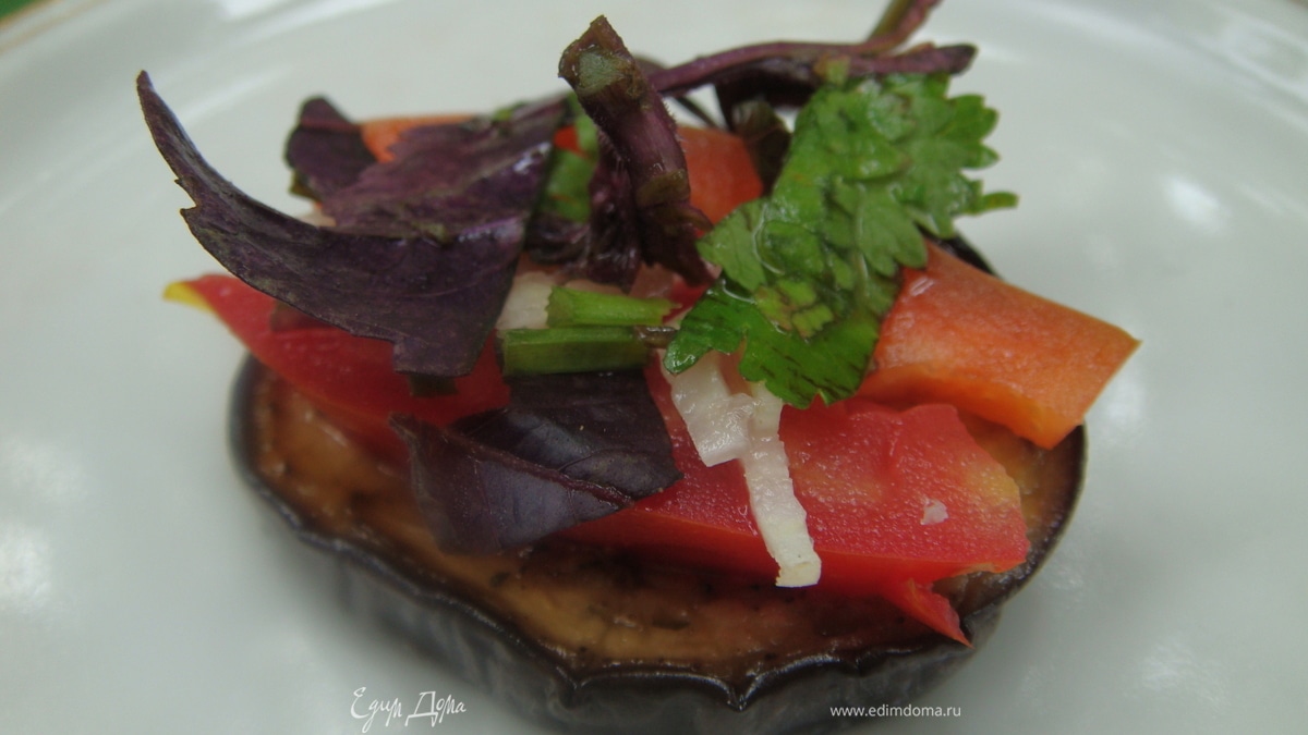 - Шаг 1Баклажаны мы нарезаем кружочками, толщиной с палец(чуть тоньше), солим перчим обжариваем с двух сторон на раскаленной сковороде с растительным маслом. Выкладываем на тарелку по кругу.