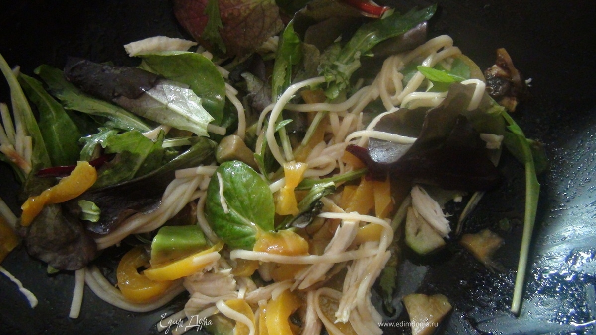 Отварить куриную грудку, разделить на волокна. Обжарить болгарский перец, порезанный тонко соломкой или слайсами. Рисовую лапшу варим мину 10. Чистим и ржем авокадо. Соединяем все ингредиенты. Подаем сразу, пока перец и лапша теплые (грудка может быть холодной). Поливаем соевым соусом. Приятного аппетита!