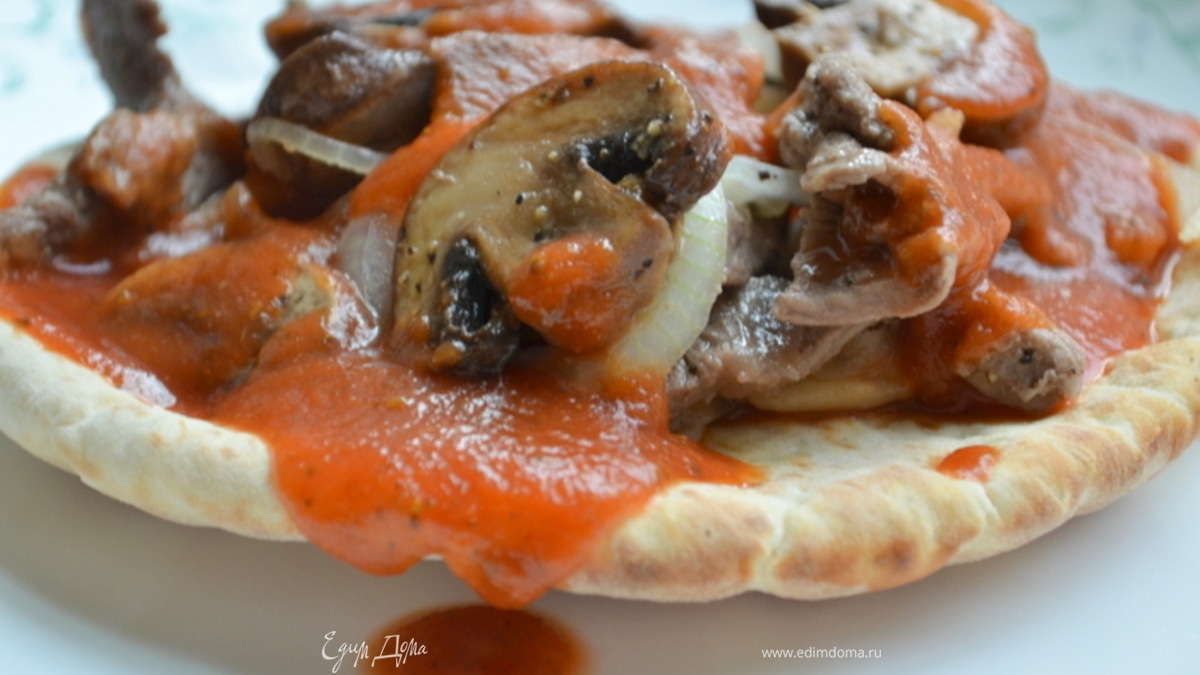 Говядину с грибами и луком подаем на лепешках, поверх соус. Приятного аппетита.