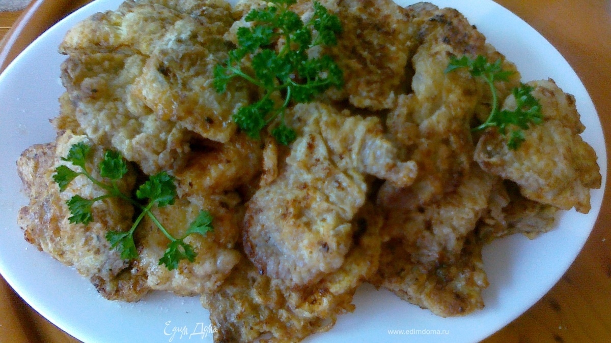 - Шаг 1Мясо промыть, нарезать тонкими пластинками. Отбить, посолить, поперчить и дать пропитаться приправами пару минут. Яйца взболтать вилочкой. Нарезанное мясо обваливаем по очереди в муке, затем в яйце и на хорошо разогретую сковородку. Обжариваем 2-3 минуты с каждой стороны. (Если вы используете мягкую часть и хорошо отбиваете мясо, 2-3 минуты достаточно для его приготовления). Выкладываем отбивные на салфетку, так как они очень много впитывают масла. В конце приготовления переложим в красивое блюдо. В глубокой тарелочке готовим соус. К майонезу добавляем натертый сыр,продавленный чеснок, мелко нарезанную зелень, выжимаем сок лимона. Перемешиваем и подаем к отбивным. Украшаем зеленью.
