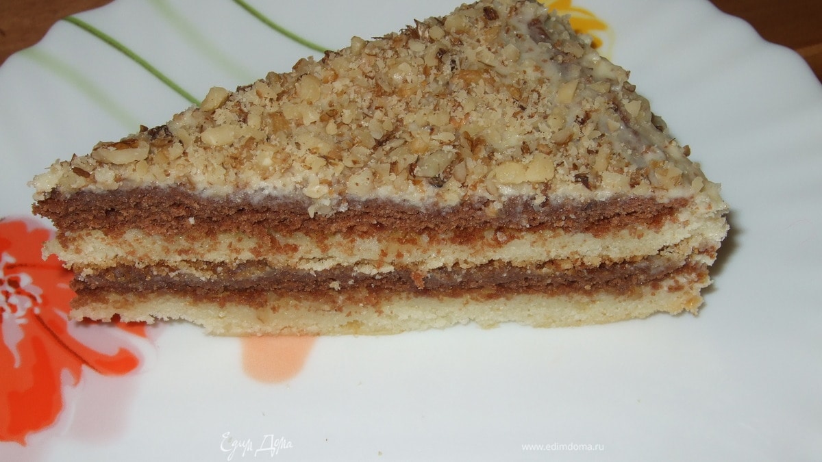- Шаг 1Тесто: Яйца взбить с сах. песком, добавить размягченное слив. масло (200 гр), сгущ. молоко(1/2 банки), разрыхлитель и муку. Тесто разделить на 2 части, в одну из которых добавить какао-порошок. Каждую из частей поделить на 2 части и испечь поочередно 4 коржа: 2 темных и 2 светлых. Печь при 180град. до готовности. Крем: взбить слив. масло (200 гр) со сгущ. молоком (1/2 банки), добавить измельченные грецкие орехи. Промазать готовые коржи кремом, начиная с темного, затем светлый и т.д. Коржи намазывать горячими, чтобы они хорошо пропитались кремом. Готовый торт поставить на ночь в холодильник.