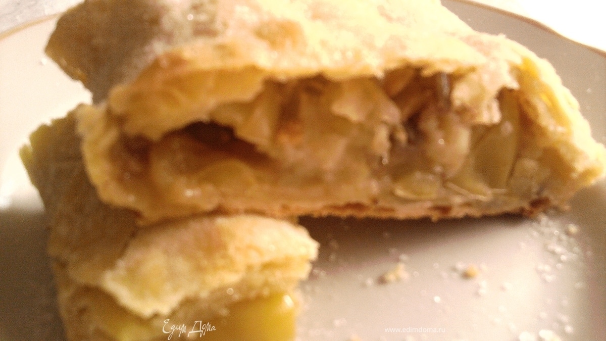 Выложить на противень смазанный маслом. Выложить штрудель швом вниз, смазать яйцом. (по рецепту смазать яйком, я смазала сливочным маслом, и когда достала ещё раз смазала слив. маслом и присыпала мелким сах. песком) В духовку 190*, 30 мин.