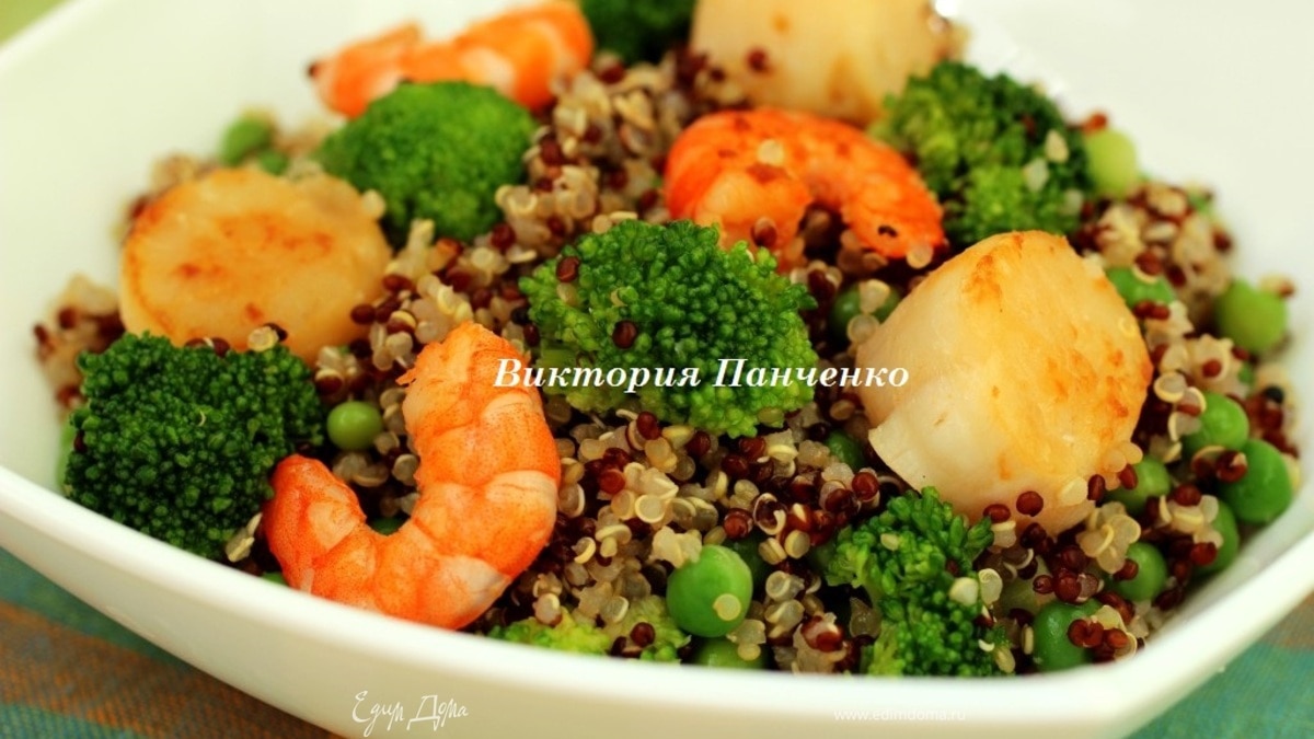 Соединить киноа, морепродукты и овощи, заправить маслом, соевым соусом и соком лайма. Перемешать и подавать салат теплым... - Шаг 5