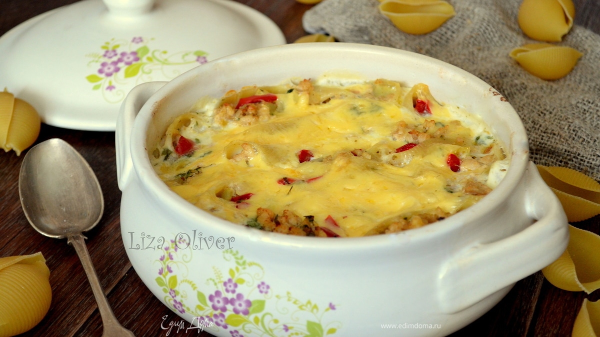 Конкильони с курицей и сладким перцем, запеченные в соусе бешамель