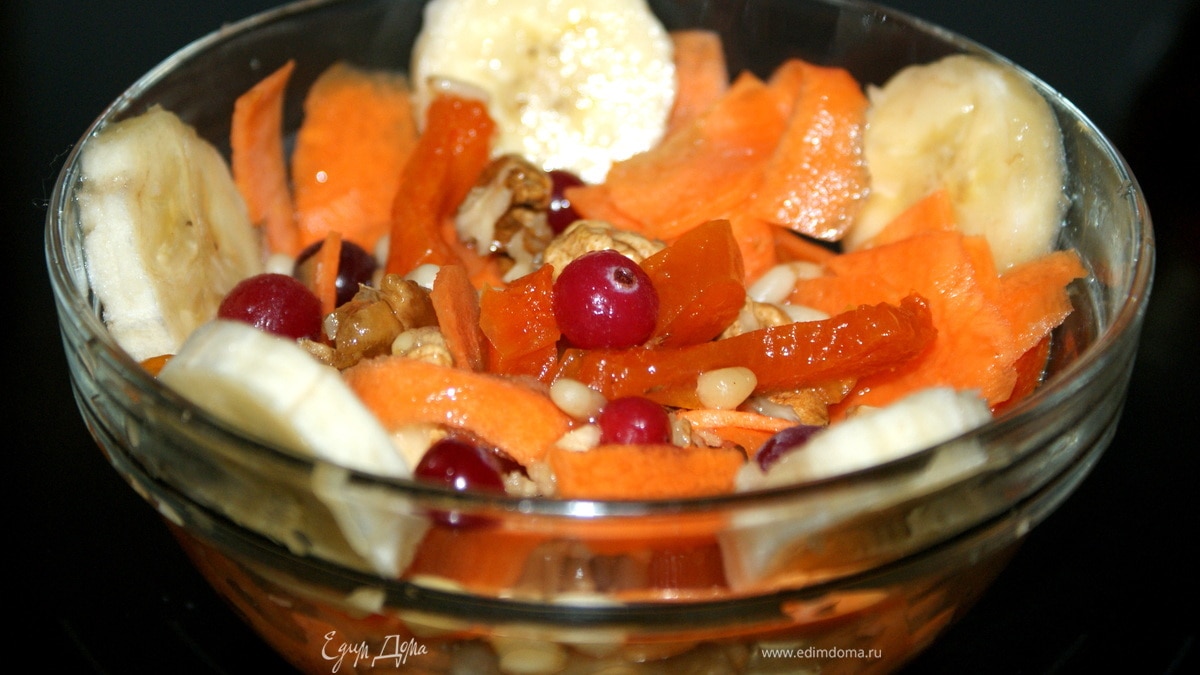 Смешиваем сок лимона, мед и имбирь, и заправляем этой смесью морковку и сухофрукты с орехами.