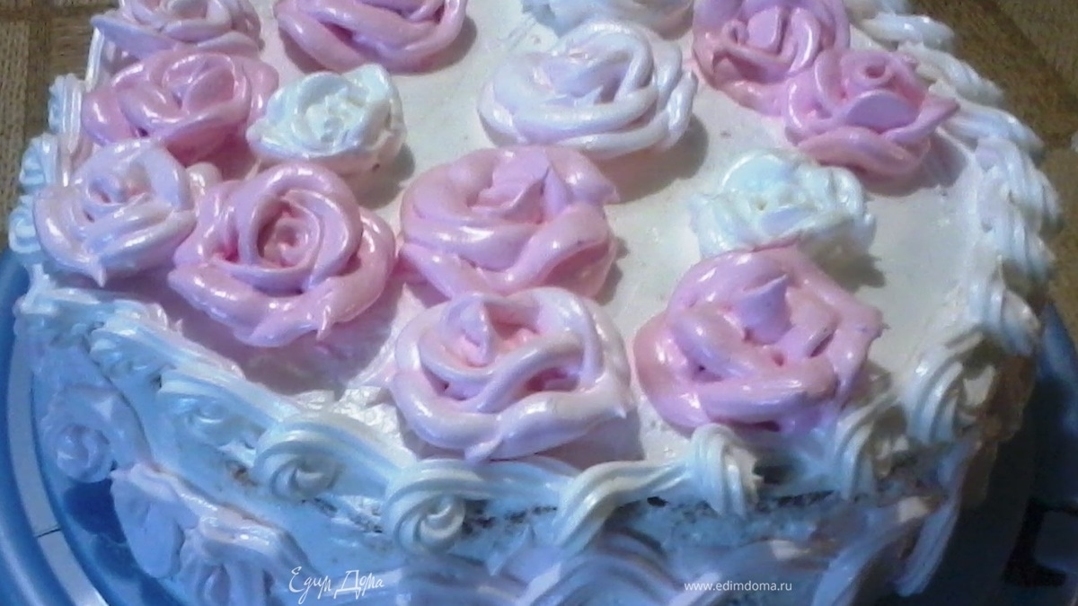 - Шаг 1Крем: Миксером слегка взбить белки, добавить сахар, ваниль и лимонную кислоту. Ставим на водяную баню, чтобы вода уже кипела и взбиваем миксером 10-15 минут. Крем получится белым и пышным. После снять с огня и взбивать еще 3-4 минуты. В середине торт смазываем сгущенным молоком взбитым со сливочным маслом.