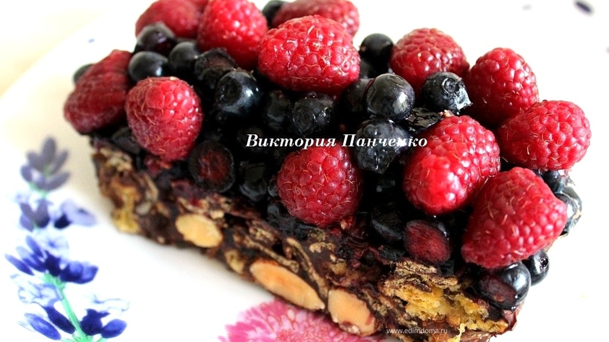 Необычное и вкусное ягодно-шоколадное пирожное без выпечки... По мотивам торта "Кранчин Манчин"... Набор ягод - по вашему вкусу (малина, клубника, голубика, смородина, черешня и т.д. и т.п.). Можно использовать пшеничные, рисовые или кукурузные воздушные хлопья. Вместо миндаля подойдут семечки подсолнечника или тыквенные....