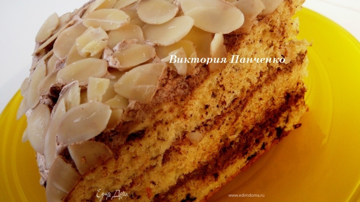 - Шаг 3Готовый бисквит достать и охладить на решетке. Я его разрезала на три равные части и прослоила Нутеллой. Сверху - миндальные лепестки.