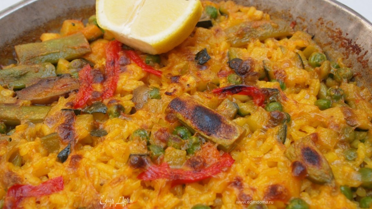 Овощная паэлья с зеленым горошком и шампиньонами
