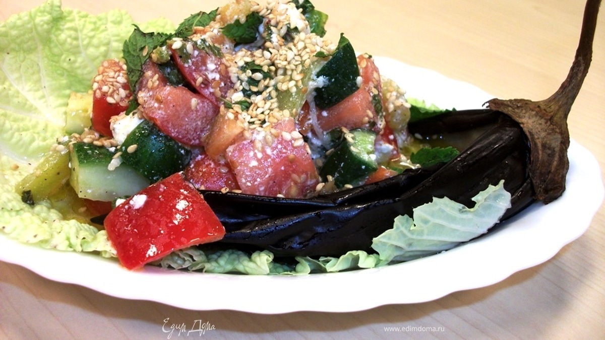 Запеченные баклажаны остужаем. Ложечкой выбираем мякоть и слегка давим ее вилкой в пюре. Кладем это "пюре" на дно лодочки, сверху выкладываем "авукму". Сервируем на салатном листе, посыпаем кунжутом.