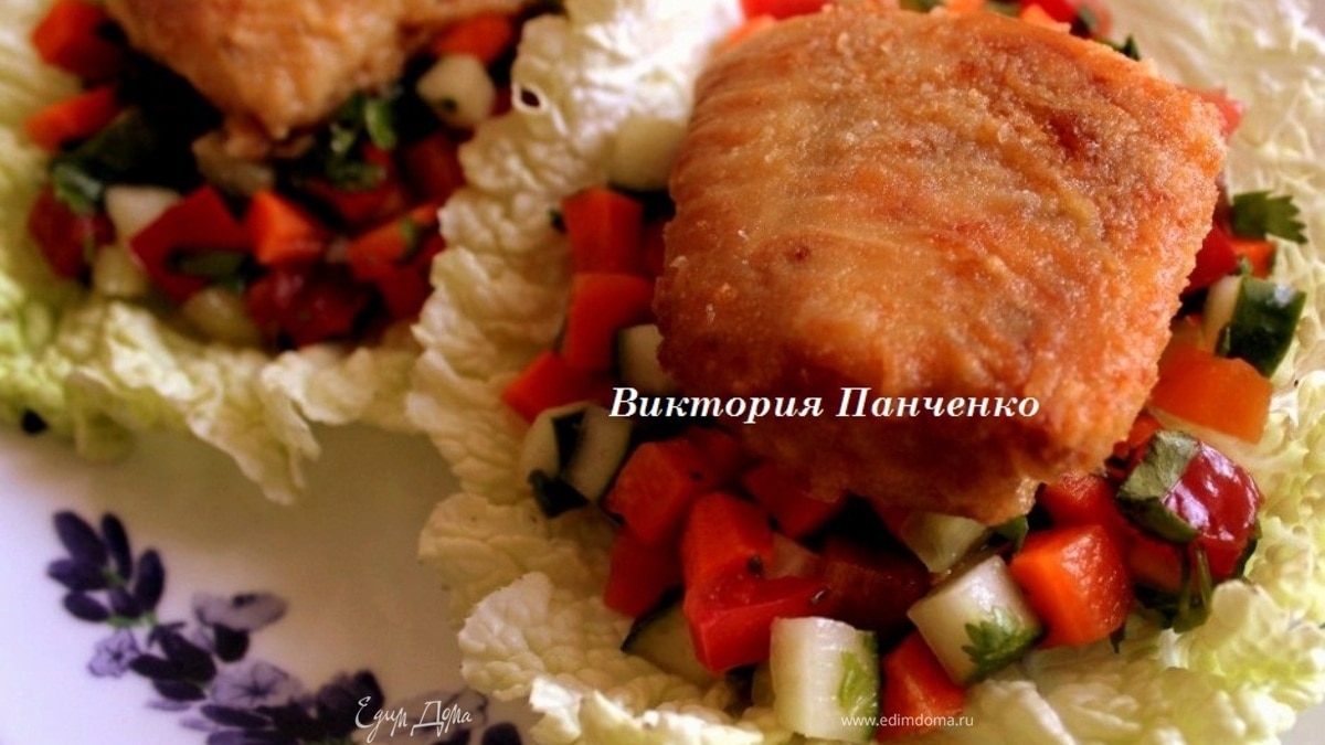 Рыбу обвалять в муке и обжарить в небольшом количестве масла. Выложить на салфетку, чтобы удалить излишки масла...Подавать в съедобных тарелках из пекинской капусты на подушке из маринованных овощей...
