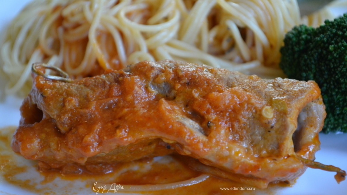 Полить томатным соусом и тушить до готовности мяса. Подавать к столу горячим. Приятного аппетита.
