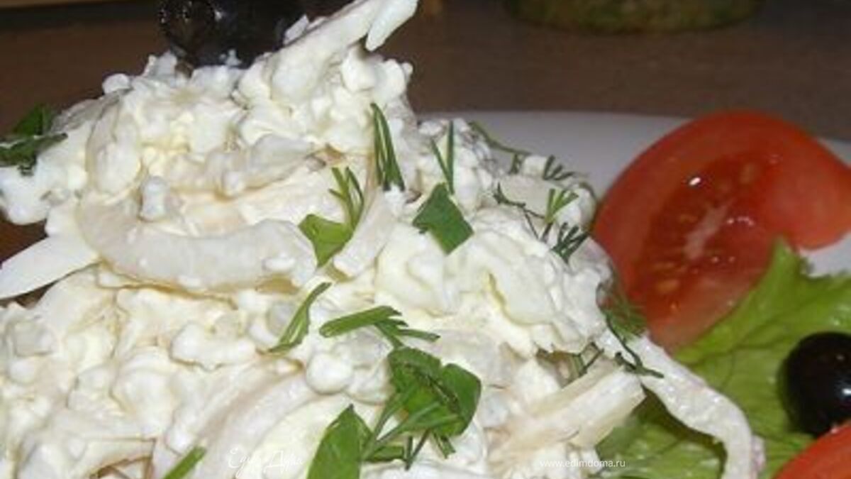 - Шаг 1Филе кальмаров отварить в течение 3—5 минут, нарезать соломкой, соединить с нашинкованным соломкой репчатым луком, рублеными яйцами, заправить майонезом и перемешать. При подаче салат полить оставшимся майонезом и добавить зелень.