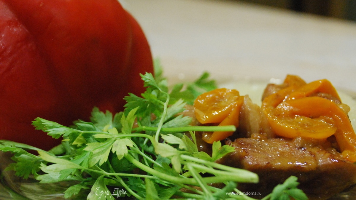 - Шаг 5В это время вновь добавить оливковое масло на сковороду и обжарить лук и перец. Когда лук станет золотистыми, вернуть обратно мясо на сковороду и полить сверху маринадом. Закрыть крышкой и тушить на среднем огне полчаса.