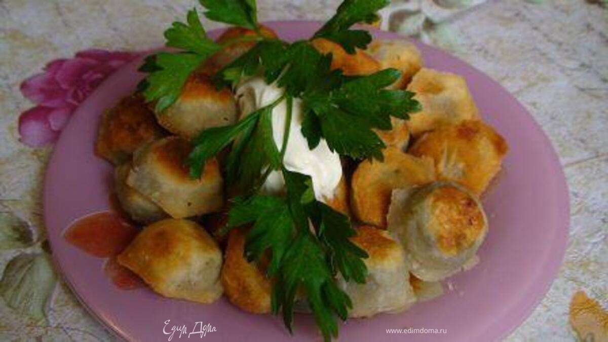 При желании такие пельмени можно немного отварить перед жаркой (если опасаетесь, что тесто может остаться сыроватым). Процесс жарения, в любом случае, придаст пельменям аппетитную румяную корочку.