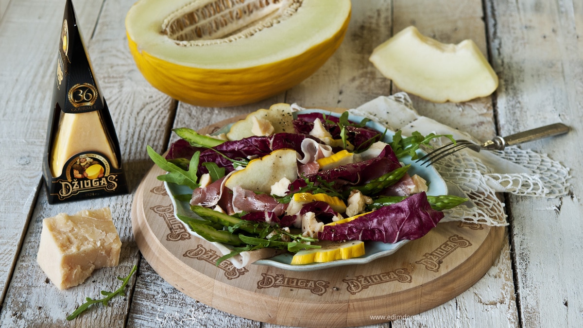 Салат с дыней, пармской ветчиной и сыром джюгас