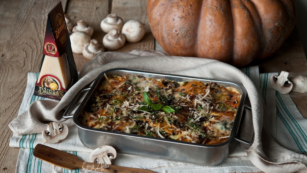- Шаг 4Соберите лазанью. На дно прямоугольной формы размером 20х30 см влейте немного сливочного соуса, затем выложите листы лазаньи, слегка вдавливая их в соус. Сверху выложите тыкву с горошком и грибы, затем 2 вида сыра и снова листы лазаньи. Повторите таким образом слои еще 2-3 раза. В конце полейте оставшимся сливочным соусом, выложите сверху кусочки горгонзолы, присыпьте хлопьями Джюгаса, украсьте красивыми ломтиками грибов, овощами и листиками тимьяна. Запекайте в разогретой до 180С духовке 35-40 минут до золотистого цвета. Подавайте лазанью горячей, украсив листиками базилика и присыпав оставшимися хлопьями Джюгаса.
