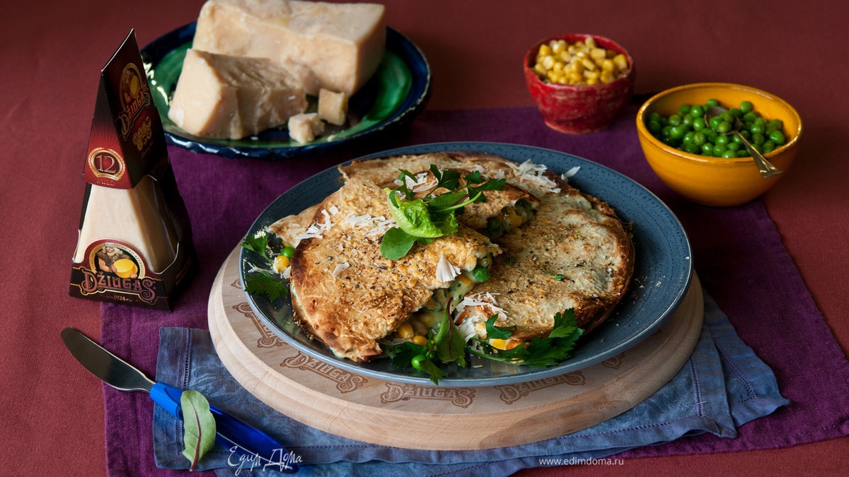 - Шаг 1Смешайте половину мелко тертого Джюгаса со сливочным сыром, петрушкой, чесноком и чили. Получившейся сырной массой смажьте лепешки, на одну половину выложите зеленый горошек, кукурузу и кусочки курицы, накройте второй половиной лепешки. Уложите кесадильи на противень, застеленный пергаментом, смажьте растительным маслом, слегка присыпьте тертым сыром и запекайте в разогретой до 210С духовке 7-8 минут до золотистого цвета.