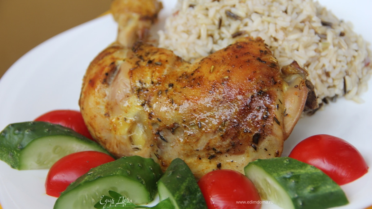 С куриной ножки снять кожу! Смазать небольшим количеством оливкового масла и натереть смесью французских трав, паприкой и куркумой...