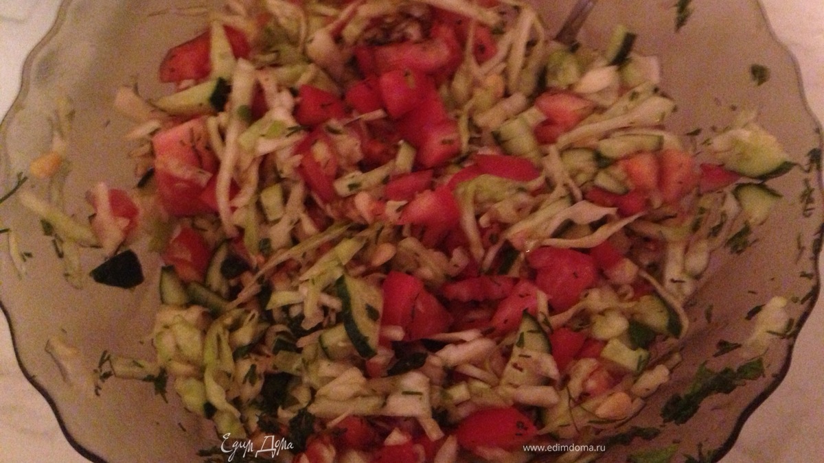 Обожаю овощные салаты во всех вариациях. Основа у меня, как правило, такая: капуста, помидоры, огурцы, дальше уже идут вариации по заправкам, травкам, маслам. Сегодня получилось вот так: