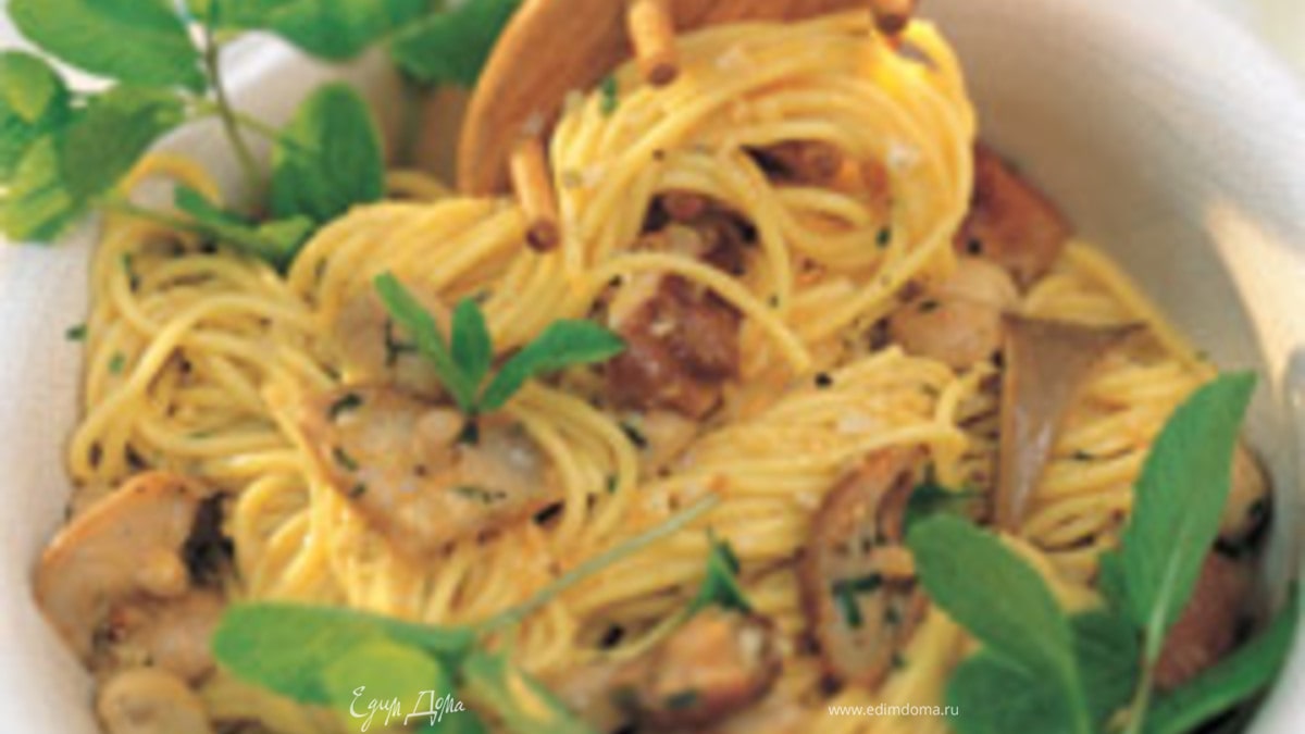 - Шаг 7Слить спагетти и добавить грибную смесь. Перед подачей украсить листочками мяты