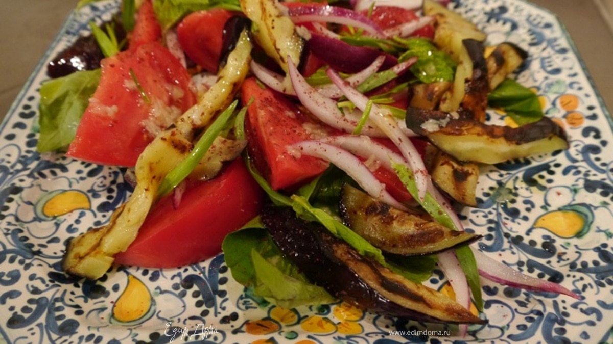 Обжаренные теплые баклажаны нарезать полосками и выложить сверху на салат, посыпать сумахом и полить чесночной заправкой.