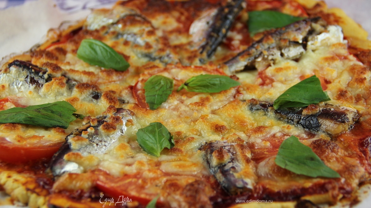 Пицца на кукурузном тесте с сардинами, томатами и моцареллой