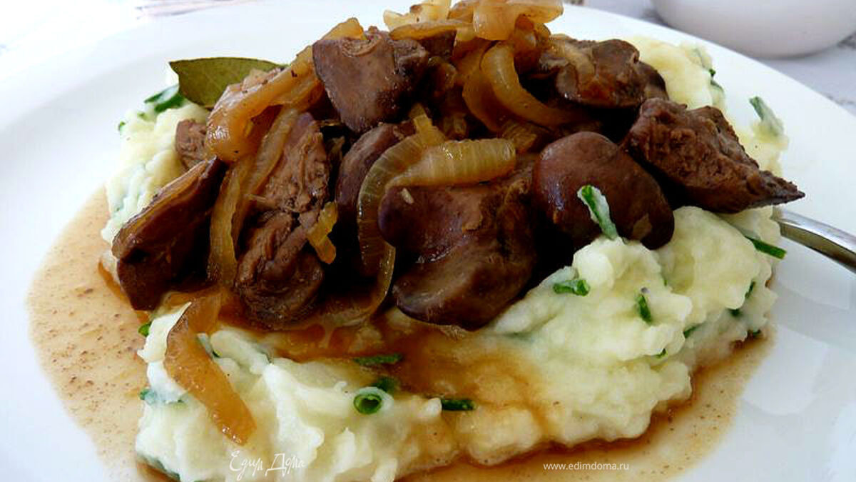 Уложить картофельное пюре на блюдо и сверху печень с луком.