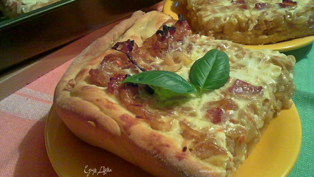 - Шаг 2Духовку нагреть до 200 гр. Тесто обмять, раскатать, выложить на противень и сформировать бортик. Обжаренные лук и бекон выложить на тесто, разровнять. Залить яично-сметанной смесью. Выпекать 20-25 минут.