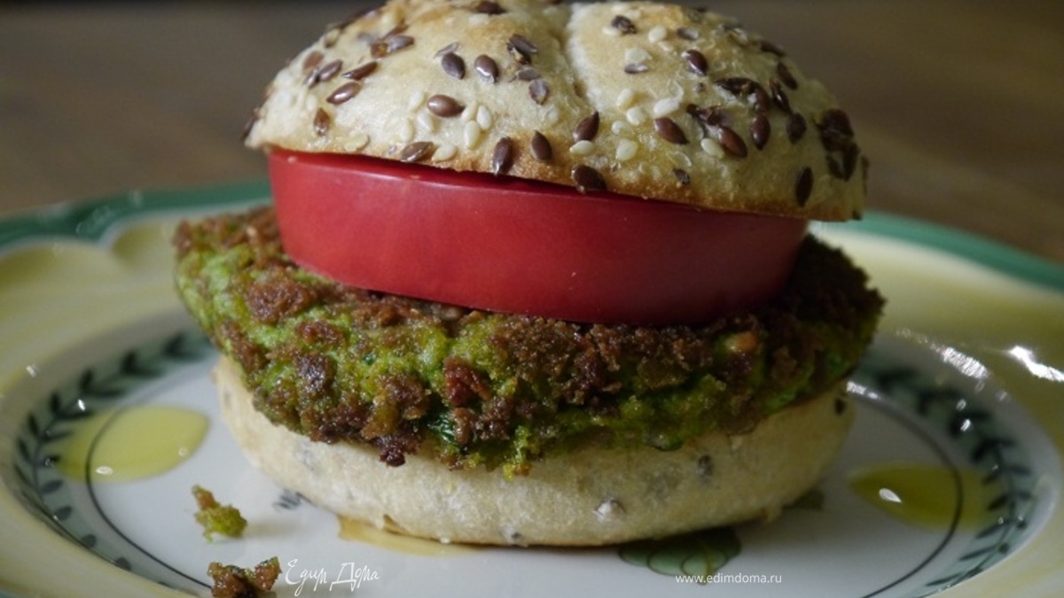 На нижнюю половину булок выложить овощную котлету, сверху кружок помидора и накрыть верхней половиной.