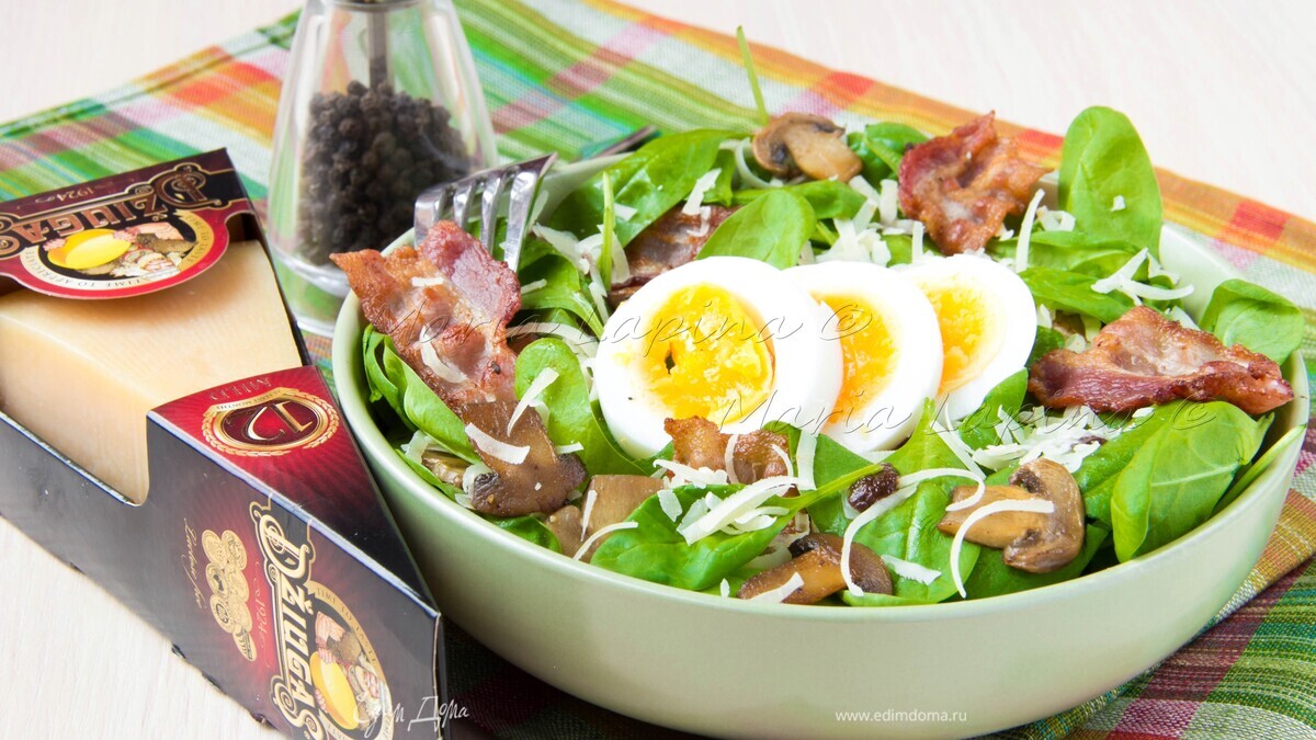 Теплый салат со шпинатом, беконом, шампиньонами и сыром Джюгас