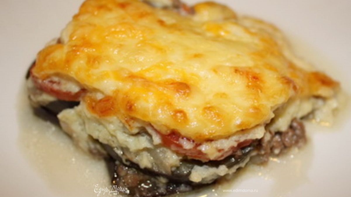 - Шаг 11. Баклажаны нарезаем кружочками, солим, обжариваем на растительном масле до полуготовности и выкладываем на салфетки, чтобы стек жир. 2. Измельчаем лук и чеснок, обжариваем на растительном масле в течение 5 минут. Затем добавляем фарш, жарим еще минут 7, вливаем вино, солим и тушим еще 7 минут. 3. Готовим соус. Для этого растапливаем в кастрюльке сливочное масло, вмешиваем в него муку. Затем постепенно, чтобы не образовалось комков, вливаем молоко. Все так же помешивая, на небольшом огне доводим соус до загустения, добавляем мускатный орех. Снимаем соус с огня и при постоянном помешивании вливаем в него взбитые яйца. 4. Приступаем к сборке. Первым слоем на дно формы кладем баклажаны. Присыпаем их слоем тертого сыра, сверху кладем слой фарша. Повторяем. На второй слой фарша кладем нарезанные кружочками помидоры, заливаем соусом.Сверху посыпаем тертым сыром и ставим форму в разогретую до 180 градусов духовку на 35-40 минут.