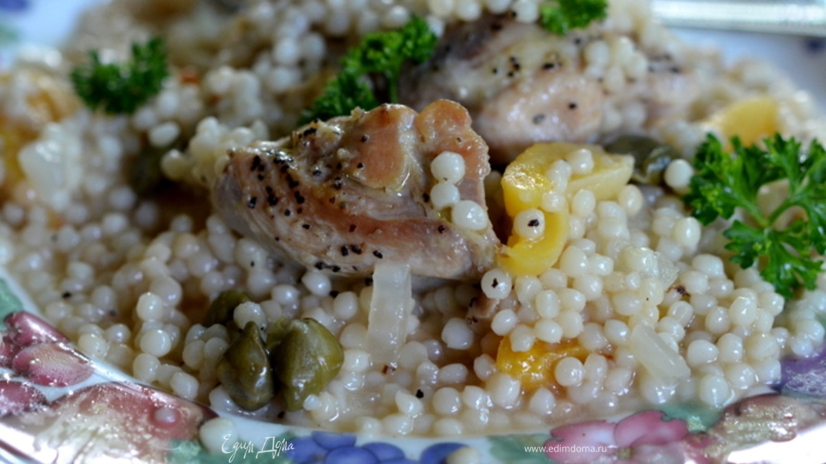 Затем добавим бульон, посолить и поперчить. Вернем куриные грудки. Закроем крышкой и тушим до полного приготовления кускуса и куриных грудок. - Шаг 3
