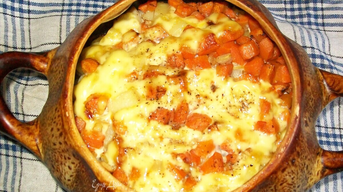 - Шаг 1Все ингридиенты нарезать как нравится (я резала кубиком), обжарить отдельно на большом огне для корочки, сложить в горшочек слоями: мясо, картофель, морковка, лук. Каждый слой подсолить, поперчить, полить майонезом, сверху посыпать сыром. Запечь при температуре 200 град. до готовности овощей (около 40-50 мин). при подаче посыпать зеленушкой.
