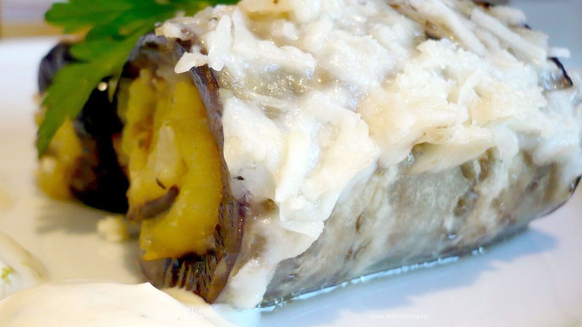 Смазываем форму для запекания оливковым маслом. Руками формируем из начинки небольшую колбаску и кладем ее на узкий кончик баклажана, заворачиваем баклажан в рулетик и кладем швом вниз в форму, слегка прижмем его. То же самое проделываем с остальными кусочками, при этом рулетики плотно прижимаем к друг другу.
